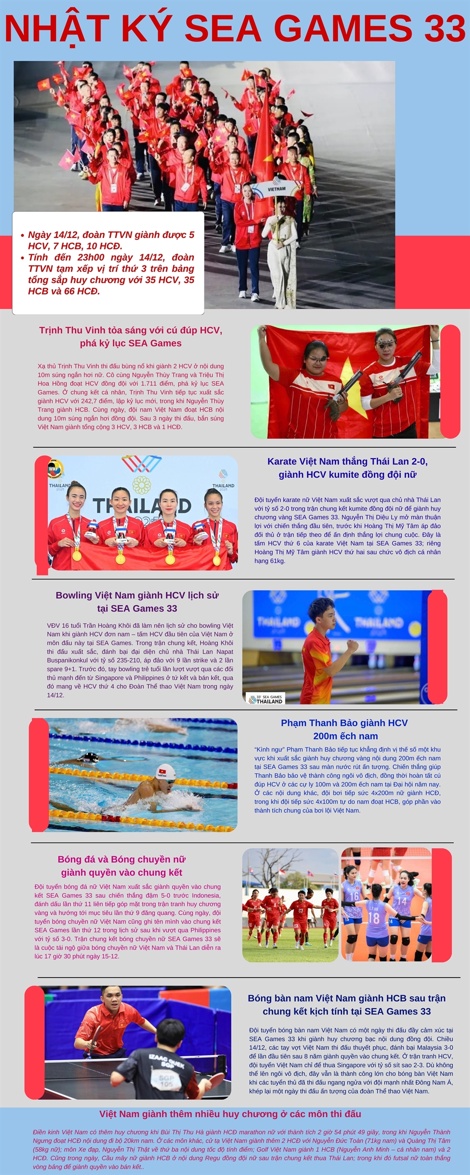 Infographic: Nhật ký SEA Games 33 ngày 14/12 của đoàn TTVN Hoạt động ngành SEA Games 33 14/12/2025 - 23:30 Trong ngày thi đấu 14/12 tại SEA Games 33, thể thao Việt Nam giành thêm 5 huy chương vàng. Trịnh Thu Vinh là gương mặt nổi bật nhất với cú đúp HCV môn bắn súng ở các nội dung 10m súng ngắn hơi đồng đội và cá nhân nữ. Tiếp nối đà hưng phấn, đội tuyển karate nữ với các võ sĩ Nguyễn Thị Diệu Ly, Hoàng Thị Mỹ Tâm và Nguyễn Thị Thu giành HCV nội dung kumite đồng đội nữ. Bất ngờ lớn nhất trong ngày đến từ VĐV 16 tuổi Trần Hoàng Khôi khi xuất sắc đoạt HCV bowling đơn nam. Khép lại ngày thi đấu thành công, “Hoàng tử ếch” Phạm Thanh Bảo tỏa sáng với tấm HCV nội dung 200m ếch nam. KC