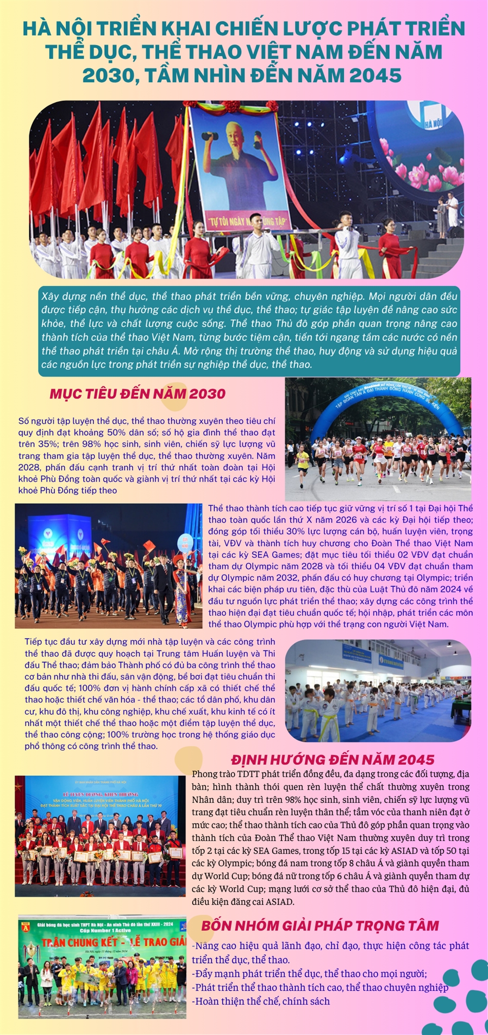Hà Nội hướng tới xây dựng nền thể thao bền vững, chuyên nghiệp và hội nhập quốc tế Truyền thông chính sách 30/09/2025 - 15:32 Triển khai thực hiện Chiến lược phát triển TD,TT Việt Nam đến năm 2030, tầm nhìn đến năm 2045, thành phố Hà Nội đặt mục tiêu xây dựng nền thể dục, thể thao phát triển bền vững, chuyên nghiệp. Mọi người dân đều được tiếp cận, thụ hưởng các dịch vụ thể dục, thể thao; tự giác tập luyện để nâng cao sức khỏe, thể lực và chất lượng cuộc sống. Thể thao Thủ đô góp phần quan trọng nâng cao thành tích của thể thao Việt Nam, từng bước tiệm cận, tiến tới ngang tầm các nước có nền thể thao phát triển tại châu Á. Mở rộng thị trường thể thao, huy động và sử dụng hiệu quả các nguồn lực trong phát triển sự nghiệp thể dục, thể thao. KC