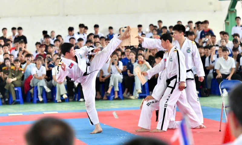 Trước đó, 20 võ sinh, võ sư của đoàn võ thuật Triều Tiên đã có những màn biểu diễn võ thuật vô cùng đẹp mắt, ấn tượng, thu hút sự cổ vỗ nhiệt tình của đông đảo các vị đại biểu, khách mời, cán bộ, giáo viên, sinh viên của nhà trường.
