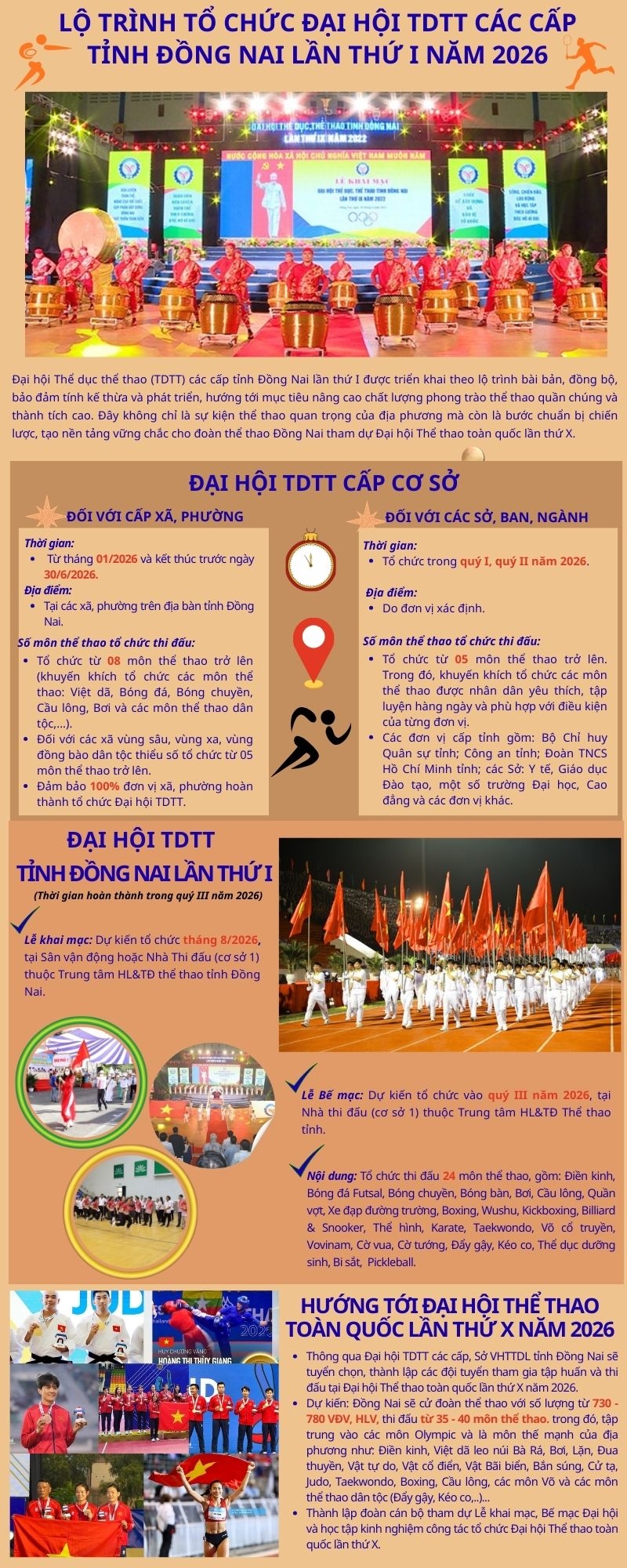 Infographic: Đồng Nai với lộ trình tổ chức Đại hội TDTT các cấp tiến tới tham dự Đại hội Thể thao toàn quốc X năm 2026 Thể thao trong nước Đại hội thể thao toàn quốc lần thứ X năm 2026 13/02/2026 - 06:33 Ngành VHTTDL tỉnh Đồng Nai đã, đang triển khai lộ trình tổ chức Đại hội TDTT các cấp lần thứ I một cách đồng bộ, bài bản, nhằm thúc đẩy phong trào thể thao quần chúng và nâng cao chất lượng thể thao thành tích cao. Đây cũng chính là bước chuẩn bị quan trọng, hướng tới việc xây dựng lực lượng VĐV có chất lượng cao, sẵn sàng tham dự Đại hội Thể thao toàn quốc lần thứ X. VD