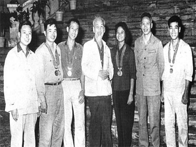 VĐV Trần Hữu Chỉ (thứ ba từ trái sang) cùng VĐV Việt Nam ở môn khác cũng giành HCV đã vinh dự được gặp Bác Hồ năm 1966