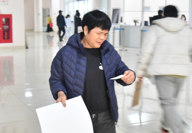 Cô Dương Thị Huy- người nhà bệnh nhân vui vẻ được phát phiếu đi nhận quà