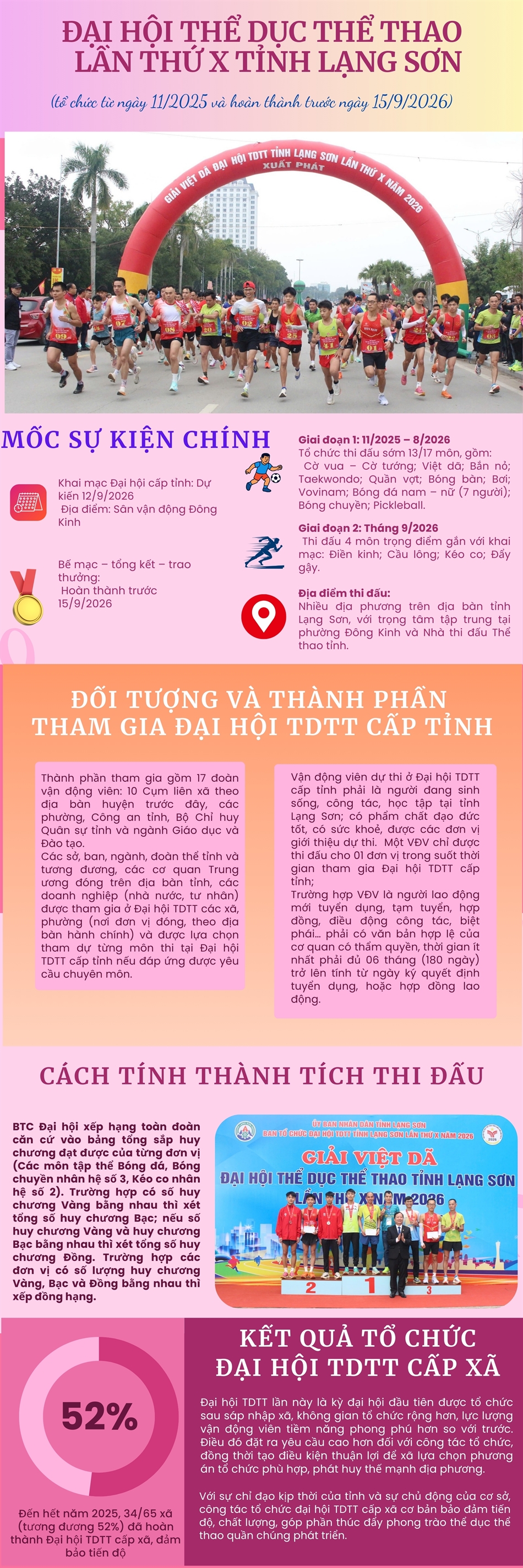 • Infographic: Lạng Sơn triển khai Kế hoạch tổ chức Đại hội Thể dục thể thao các cấp lần thứ X năm 2026