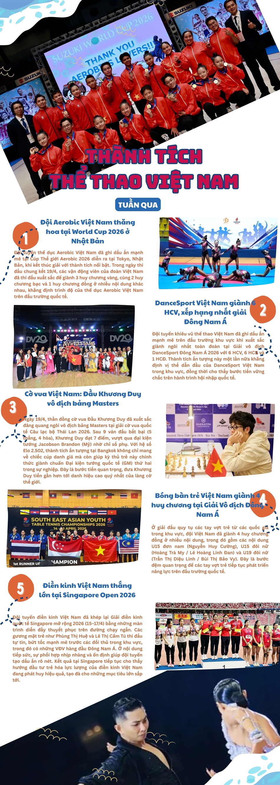 Infographic: Thành tích nổi bật Thể thao Việt Nam tuần qua Hoạt động ngành 21/04/2026 - 09:44 Trong những ngày trung tuần tháng 4, thể thao Việt Nam liên tiếp đón nhận tin vui từ các đấu trường quốc tế. Từ điền kinh, bóng bàn trẻ đến khiêu vũ thể thao và Aerobic, các vận động viên đã thi đấu tự tin, bản lĩnh và để lại dấu ấn rõ nét trước những đối thủ mạnh trong khu vực và châu lục. Những kết quả tích cực này không chỉ mang về niềm tự hào mà còn cho thấy sự chuẩn bị bài bản, hướng đi đúng trong chiến lược đào tạo lực lượng trẻ, tạo nền tảng vững chắc cho các mục tiêu lớn phía trước. KC