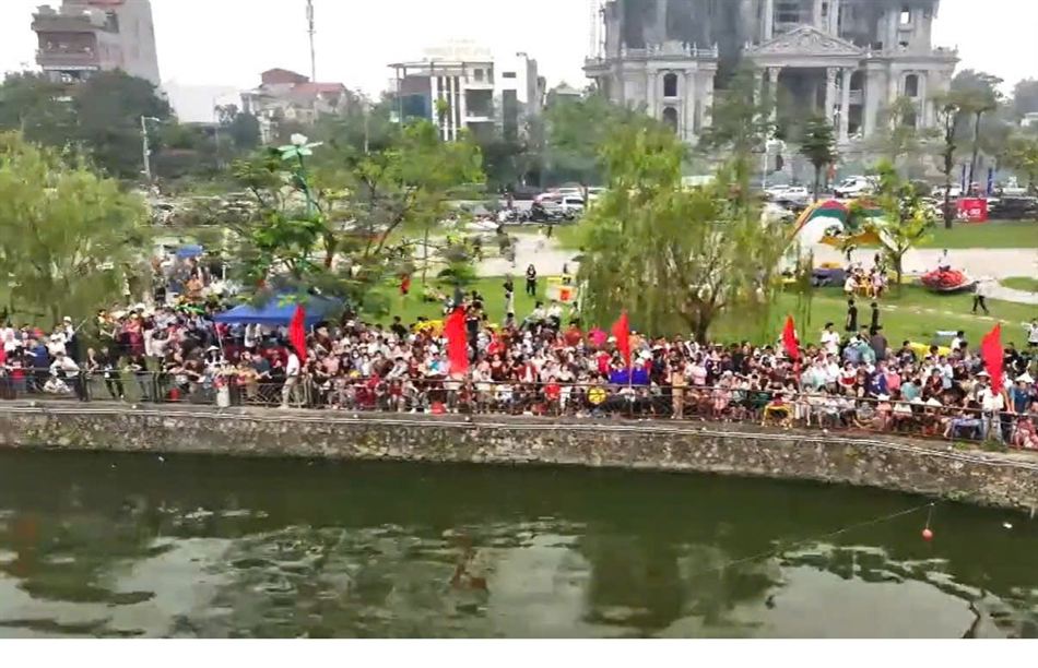 Người dân và du khách đứng kín hai bên bờ, hò reo cổ vũ, tạo nên không gian lễ hội náo nhiệt, thắm đượm tinh thần cộng đồng.