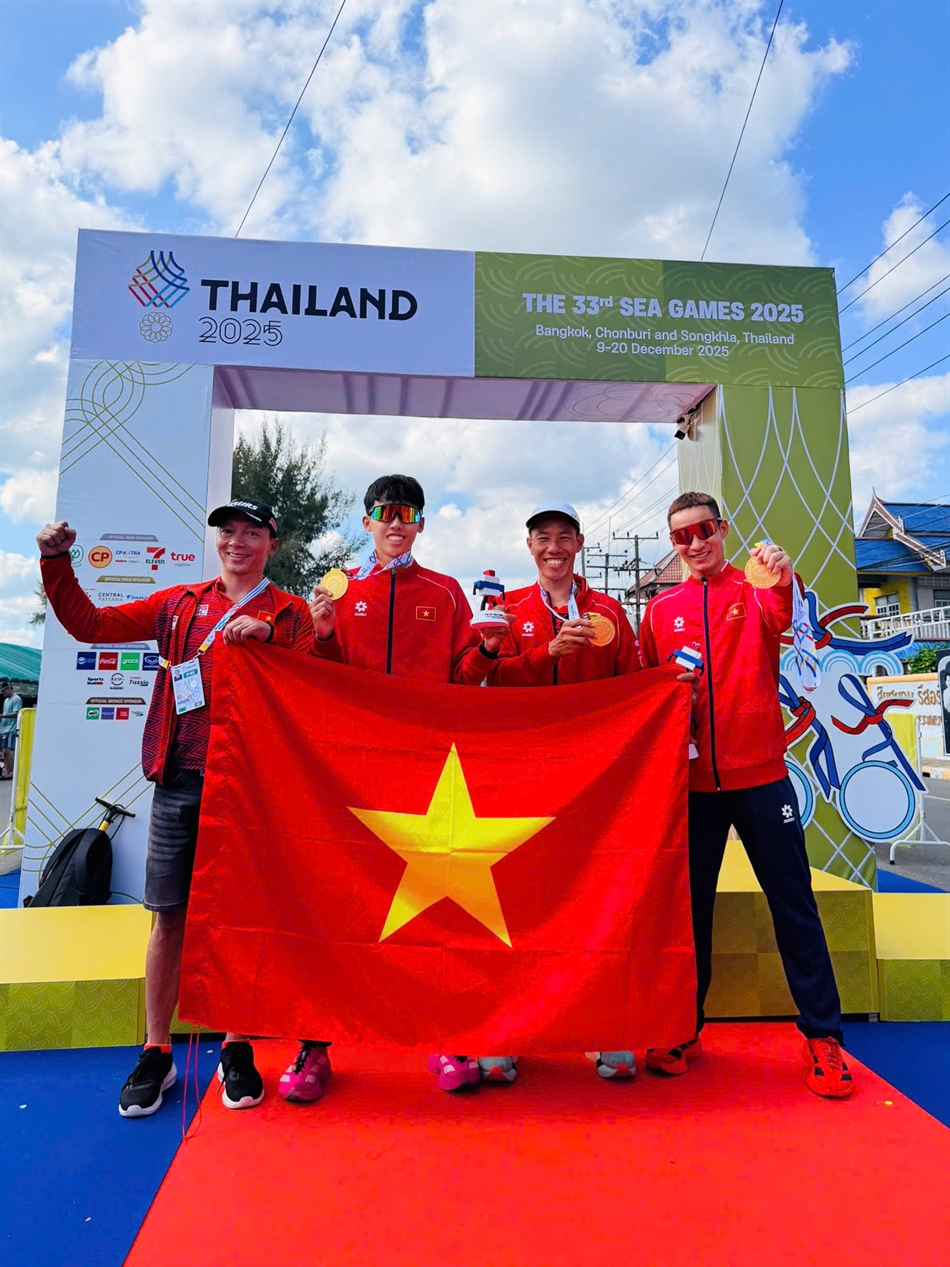 Cụ thể, tấm HCV thuộc về bộ ba Nguyễn Lê Hoàng Vũ, Nguyễn Anh Trí, Phạm Tiến Sản đã thi đấu xuất sắc mang về cho Duathlon Việt Nam tấm HCV nội dung tiếp sức đồng đội nam. Nhà vô địch SEA Games 31 Phạm Tiến Sản là người hoàn tất phần thi cuối cùng, xuất sắc đánh bại đối thủ đáng gờm người Indonesia chỉ vài bước chân để giành chiến thắng.