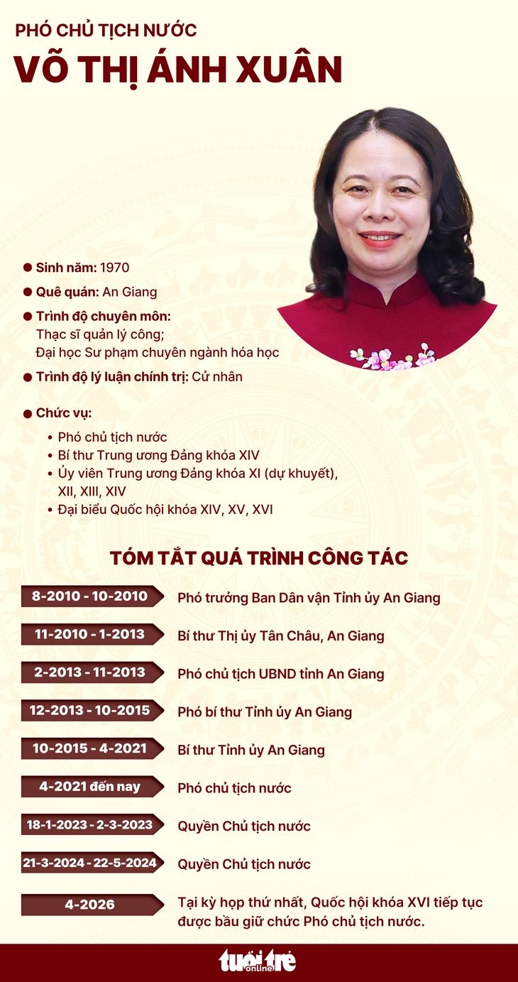 Chiều 7-4, với 485/485 đại biểu, bằng 100% đại biểu có mặt tham gia biểu quyết tán thành, Quốc hội đã thông qua nghị quyết bầu bà Võ Thị Ánh Xuân, Bí thư Trung ương Đảng, Phó chủ tịch nước nhiệm kỳ 2021 - 2026, đại biểu Quốc hội khóa XVI tiếp tục giữ chức Phó chủ tịch nước nhiệm kỳ 2026 - 2031.