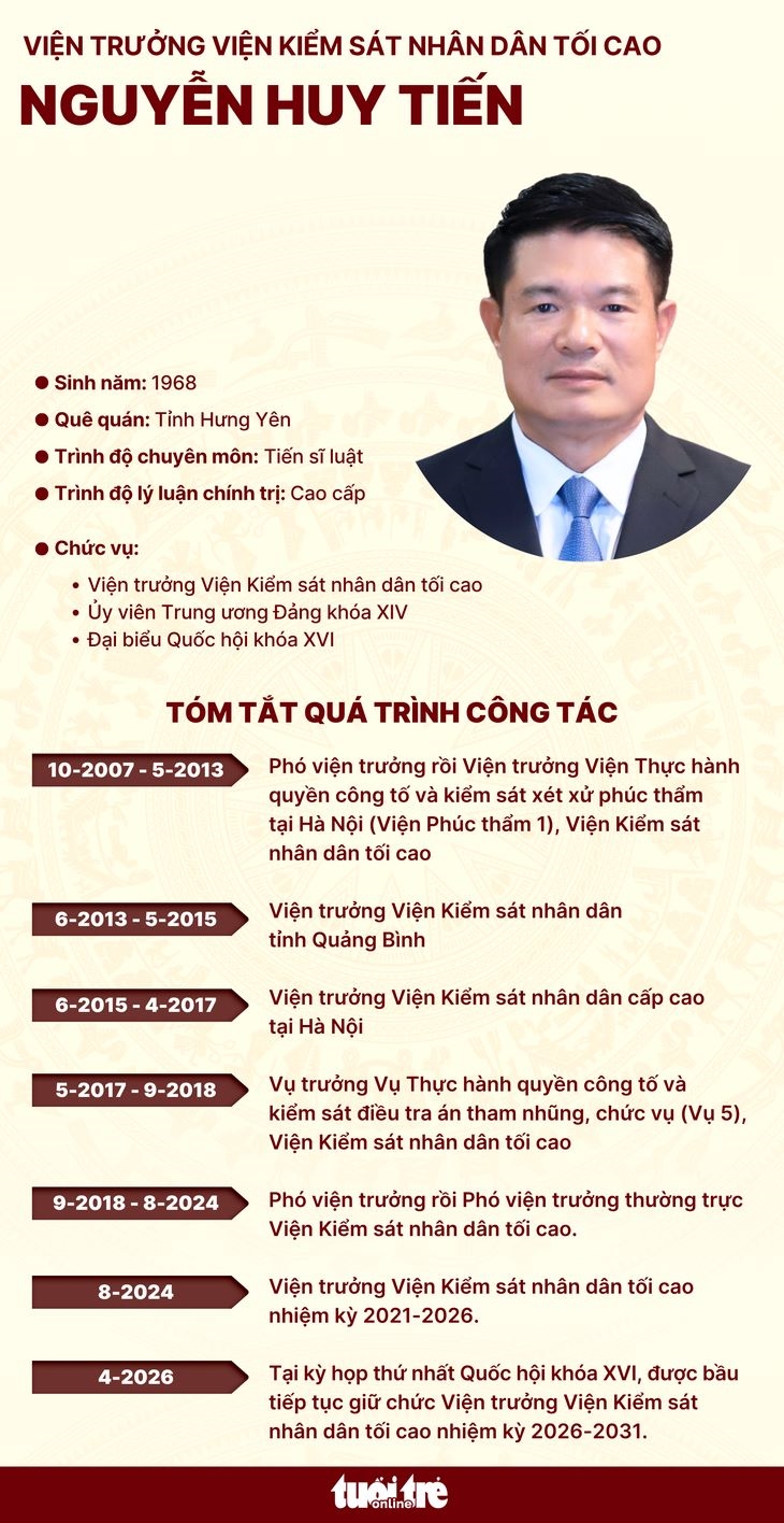 Chiều 7-4, với 474/474 đại biểu, bằng 100% đại biểu tham gia biểu quyết tán thành, Quốc hội đã thông qua nghị quyết bầu ông Nguyễn Huy Tiến, Viện trưởng Viện Kiểm sát nhân dân tối cao nhiệm kỳ 2021 - 2026, tiếp tục giữ chức Viện trưởng Viện Kiểm sát nhân dân tối cao nhiệm kỳ 2026 - 2031.
