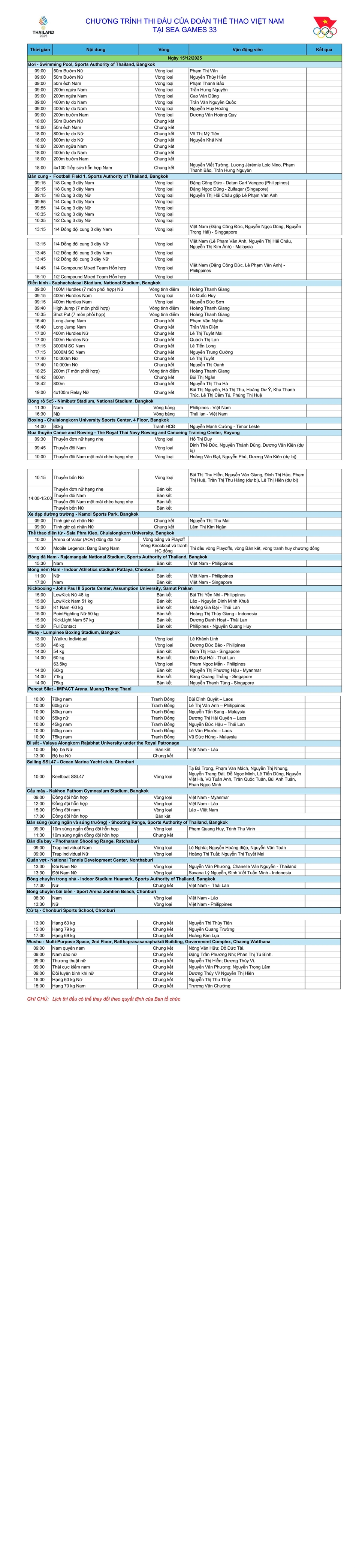 Trước đó, người hâm mộ cũng dành sự quan tâm cho trận bán kết bóng đá nam SEA Games 33 giữa U22 Việt Nam và U22 Philippines, diễn ra lúc 15h30 trên sân Rajamangala. U22 Philippines được đánh giá là đối thủ không dễ chơi khi toàn thắng vòng bảng trước những đội bóng mạnh như U22 Indonesia và U22 Myanmar.
