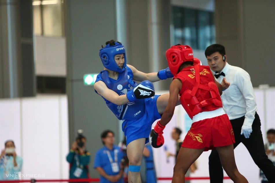 Tấm HCV đầu tiên của đoàn TTVN trong ngày 15/12 thuộc về võ sĩ Nguyễn Thị Thu Thủy - môn Wushu ở nội dung tán thủ 60kg nữ. Đối đầu với võ sĩ Myanmar, Thu Thủy thi đấu áp đảo hoàn toàn và giành chiến thắng sớm ngay trong hiệp 1 do khoảng cách điểm số quá lớn. Chiến thắng này tiếp tục khẳng định đẳng cấp của nữ võ sĩ hàng đầu Wushu Việt Nam, người từng vô địch thế giới năm 2023 và bảo vệ thành công danh hiệu thế giới năm 2025.