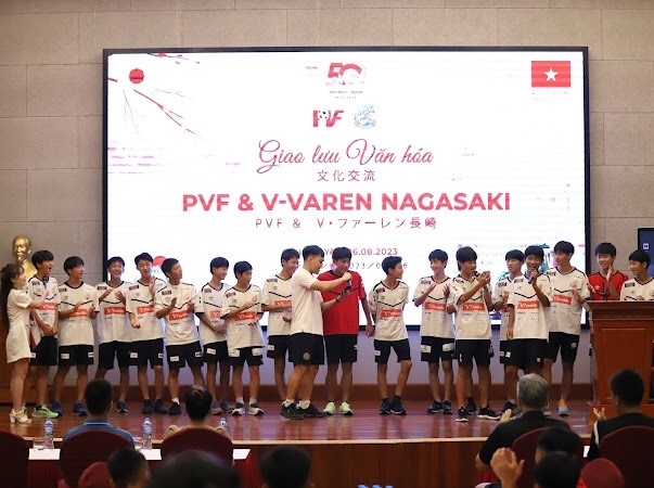 The Japanese Varen Nagasaki U15 squad takes part in an exchange meeting with Viet Nam’s PVF U15 team
