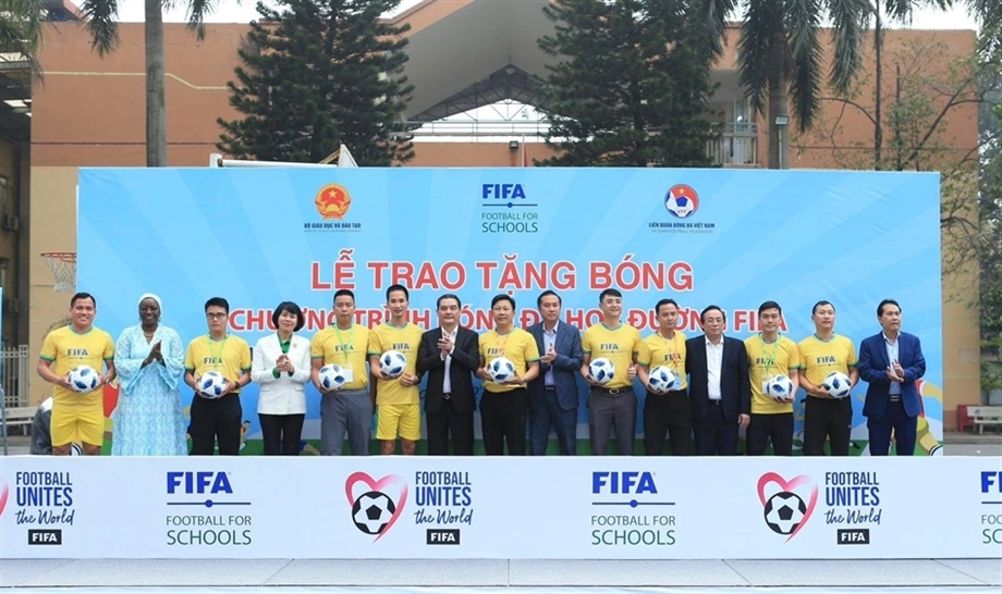 Representatives of the Sports Authority of Viet Nam and FIFA attended a ceremony to present footballs to schools nationwide.