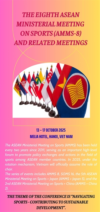Infographic: THE EIGHTH ASEAN MINISTERIAL MEETING ON SPORTS (AMMS-8) AND RELATED MEETINGS News 12/10/2025 - 13:25 The ASEAN Ministerial Meeting on Sports (AMMS) has been held every two years since 2011, serving as an important high-level forum to promote policy exchanges and actions in the field of sports among ASEAN member countries. In 2025, under the rotation mechanism, Vietnam will officially assume the role of chair. The series of events includes AMMS 8, SOMS 16, the 5th ASEAN Ministerial Meeting on Sports + Japan (AMMS + Japan 5), and the 2nd ASEAN Ministerial Meeting on Sports + China (AMMS + China 2). The theme of the Conference is “Navigating Sports - Contributing to Sustainable Development”. Nguyen Khang