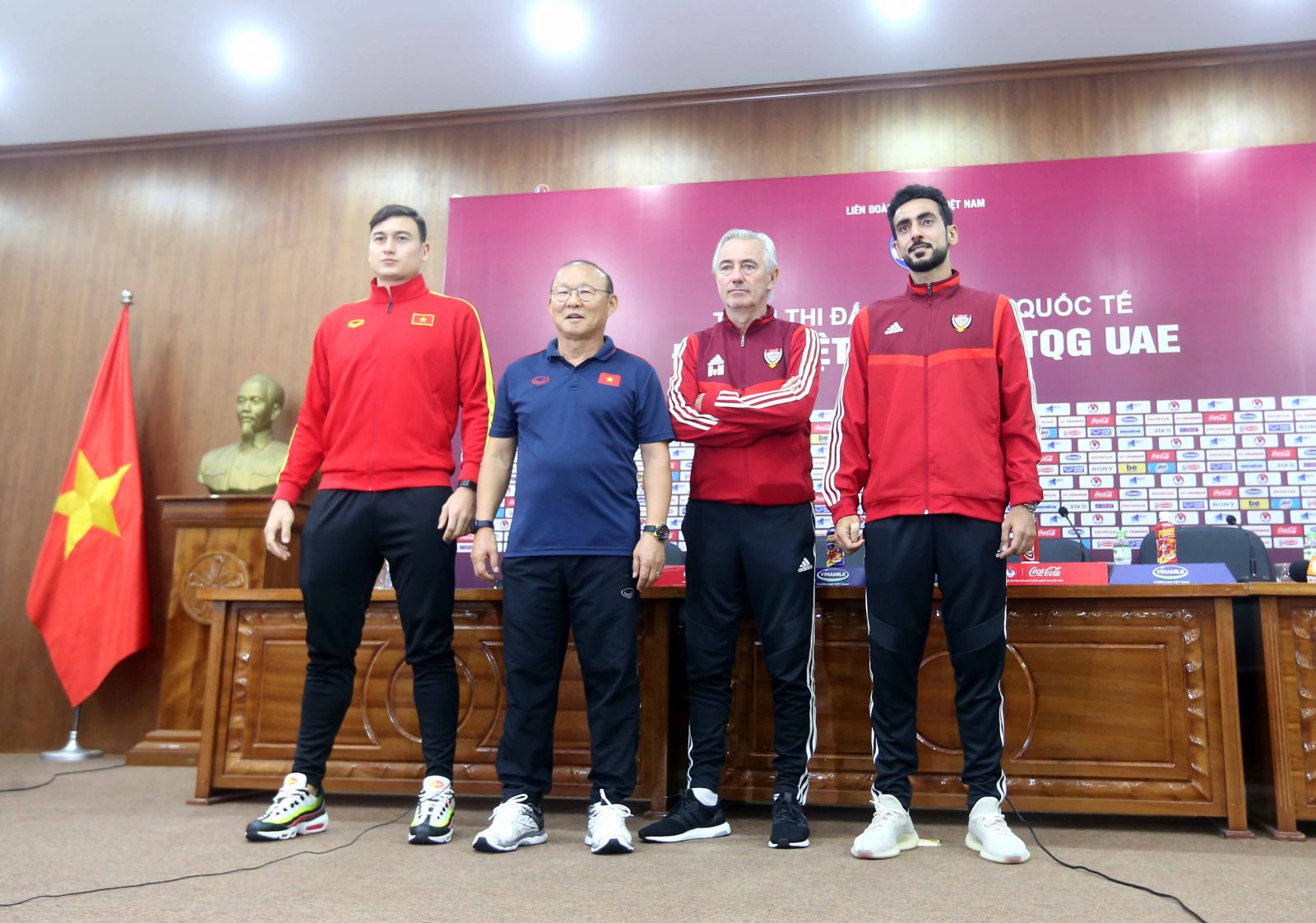 HLV trưởng đội tuyển Việt Nam và HLV trưởng đội tuyển UAE cùng các cầu thủ tại buổi họp báo trưa ngày 13/11 (Ảnh: VFF)