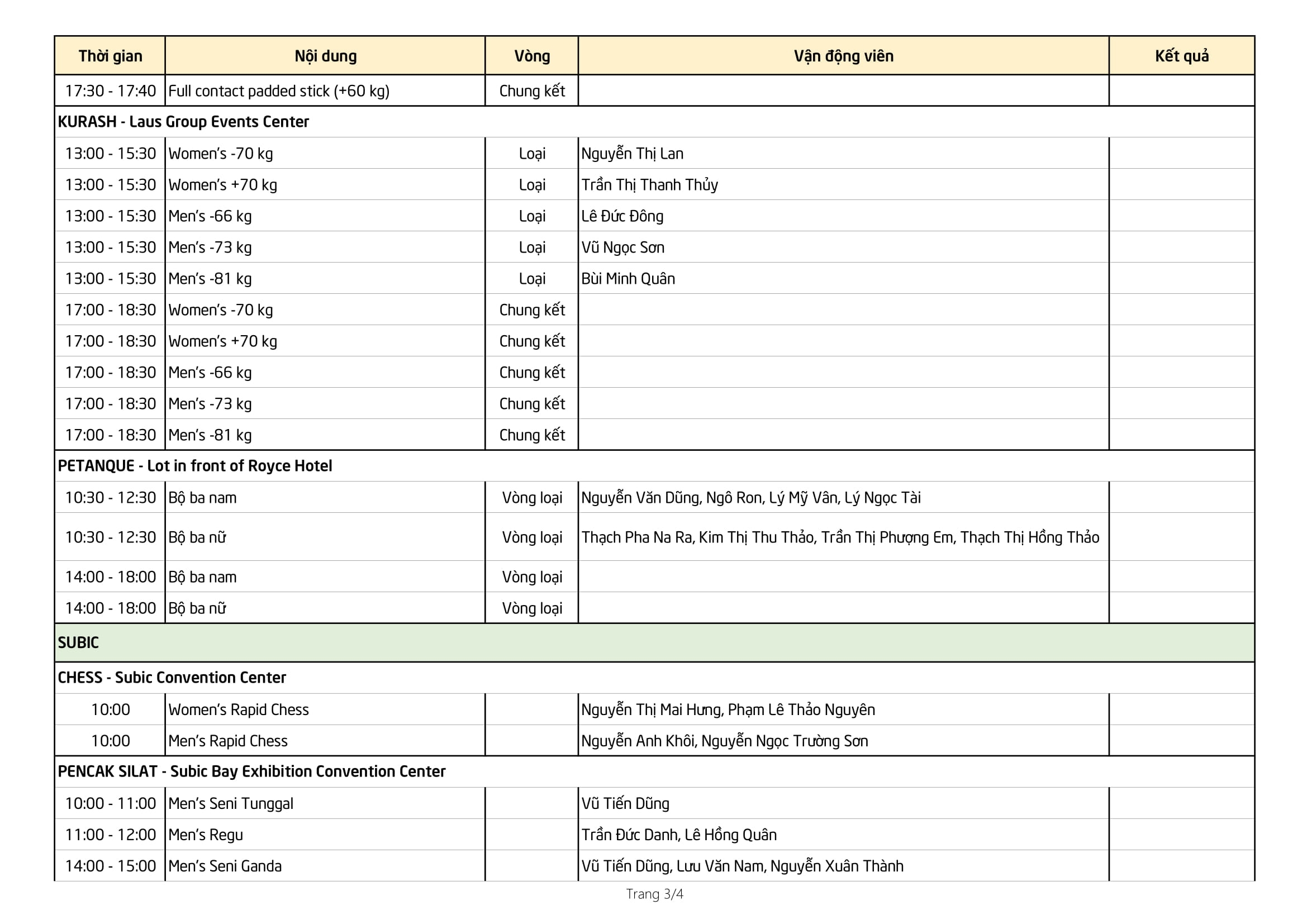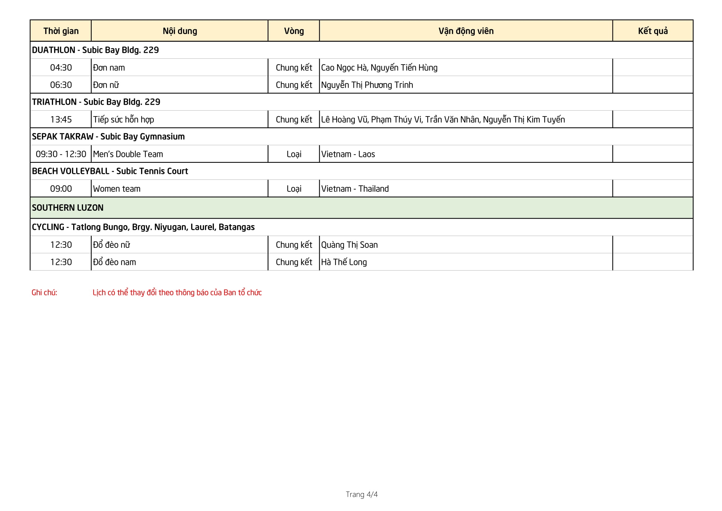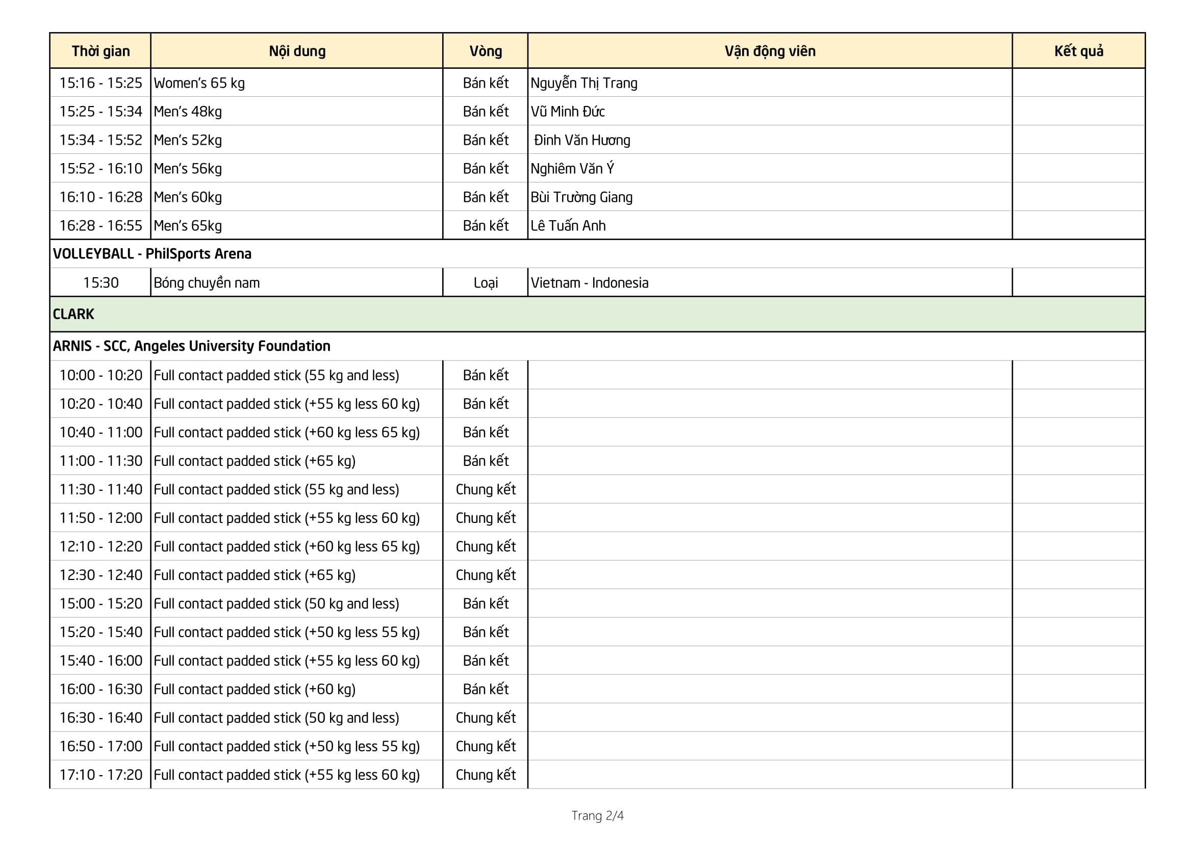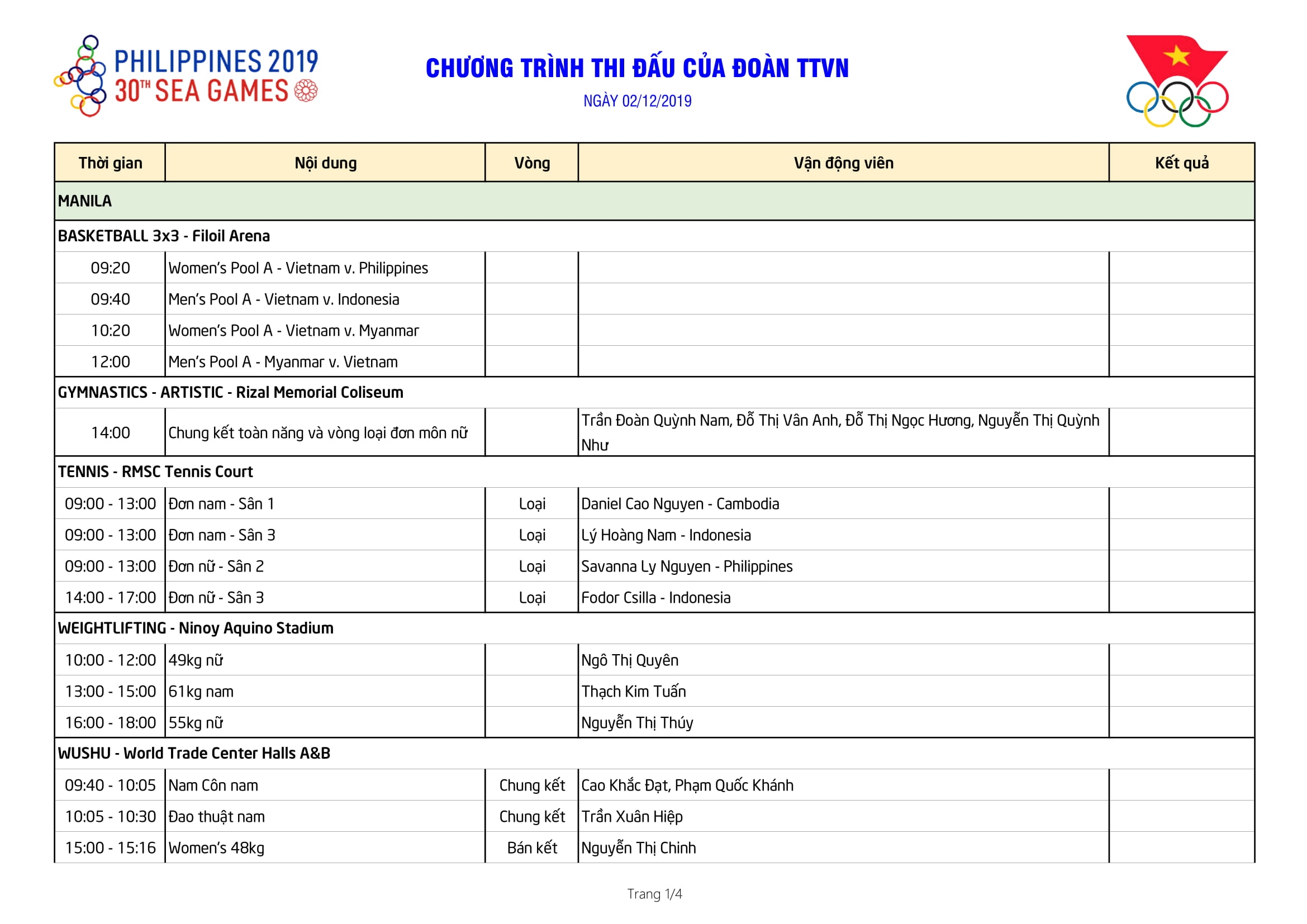 Dưới đây là lịch thi đấu của Đoàn TTVN ngày 02/12