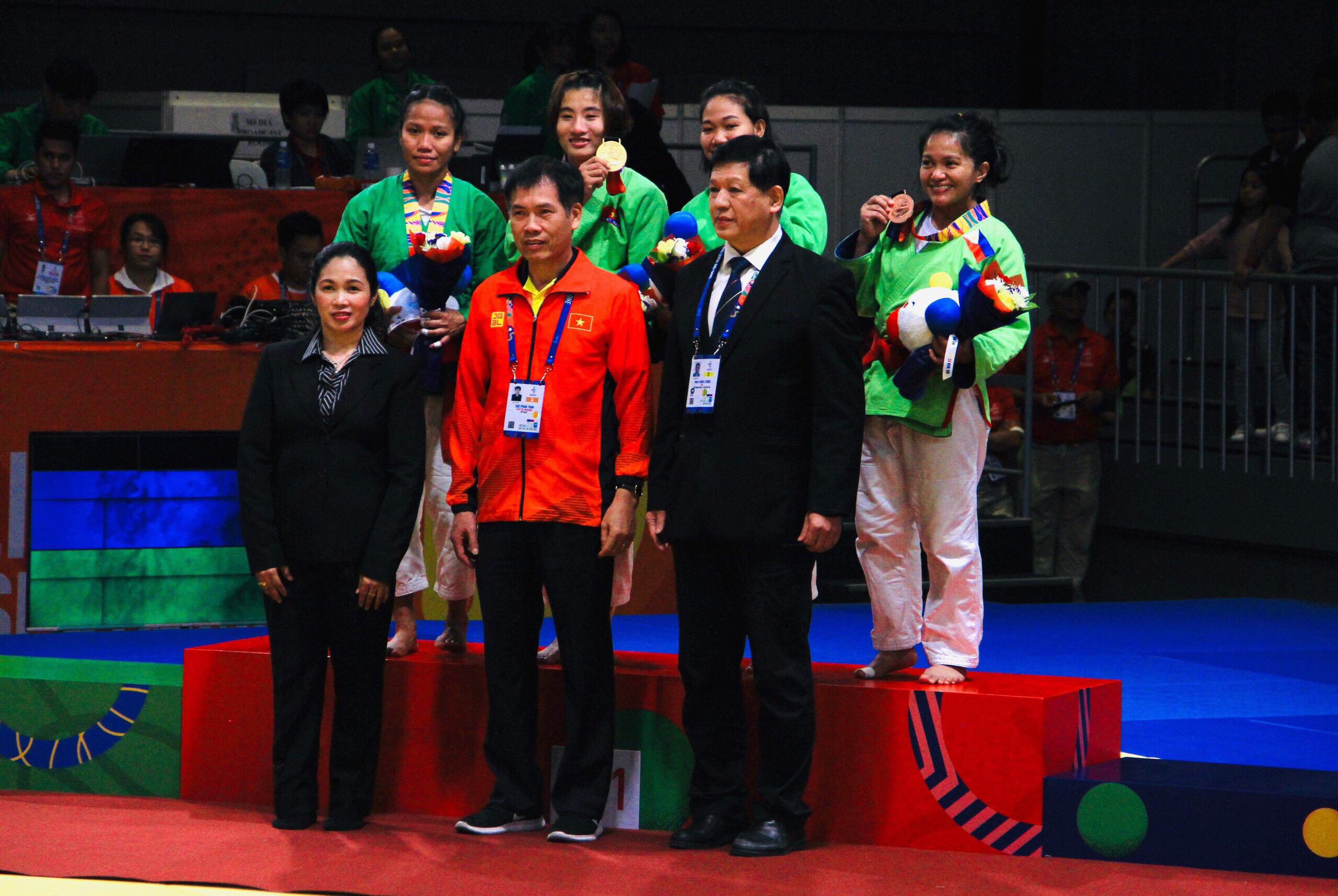Trưởng đoàn TTVN Trần Đức Phấn tới chúc mừng tấm HCV của Kurash