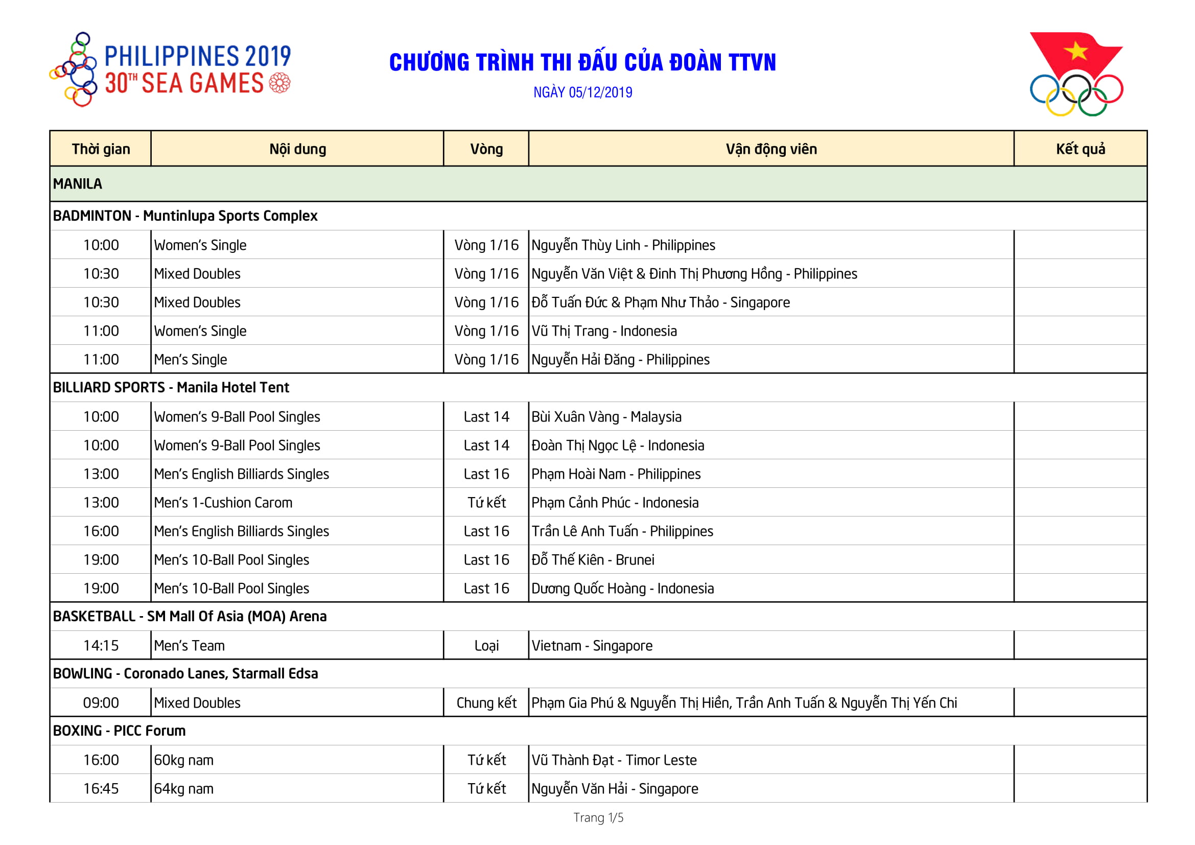 Môn Bóng rổ 5x5 diễn ra ở MALL OF ASIA ARENA lúc 13:15 ở các nội dung vòng bảng Việt Nam - Singapore. Môn Bóng chuyền diễn ra ở PhilSports Arena lúc 15:30 với trận dấu vòng loại nữ Việt Nam - Indonesia.