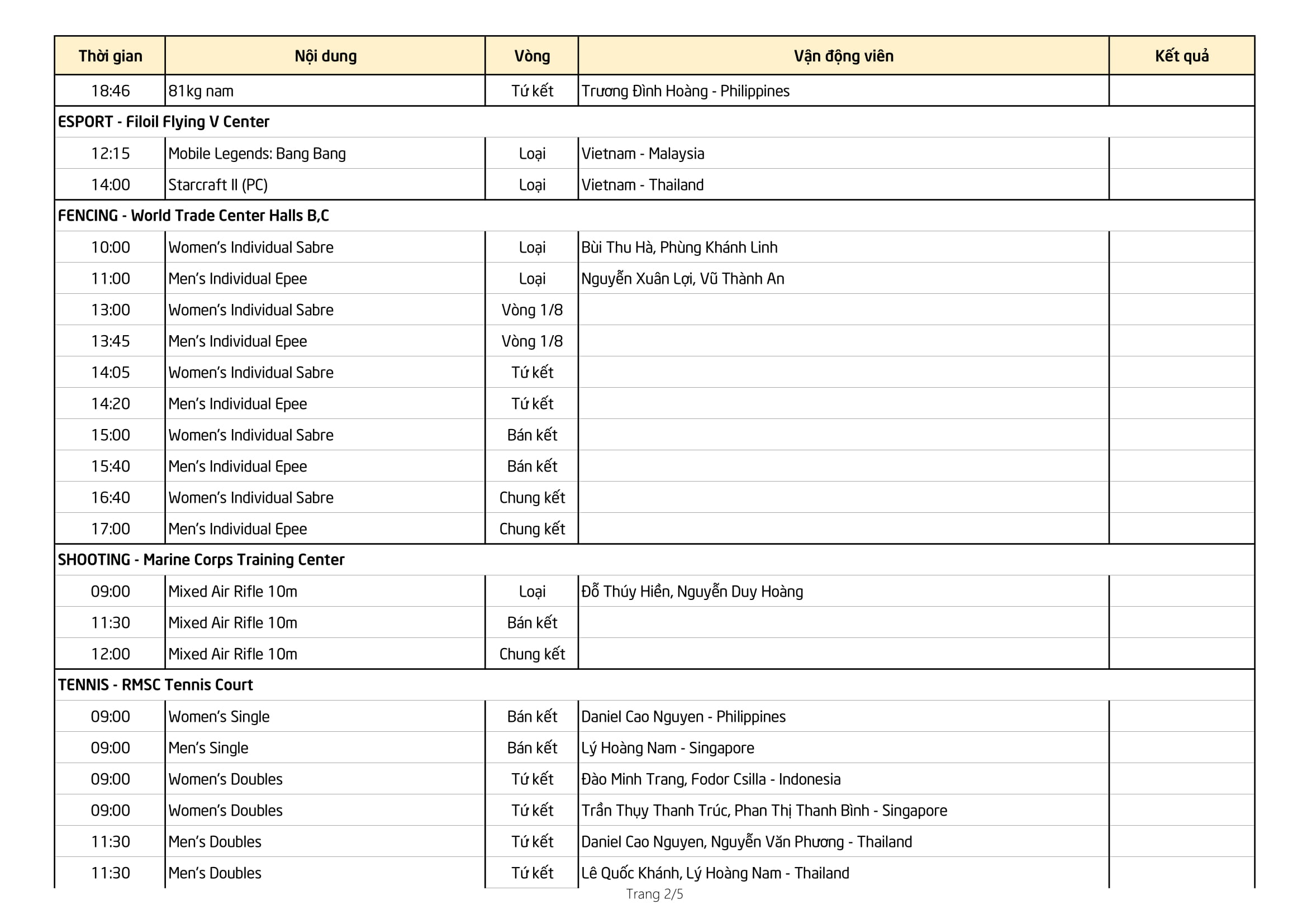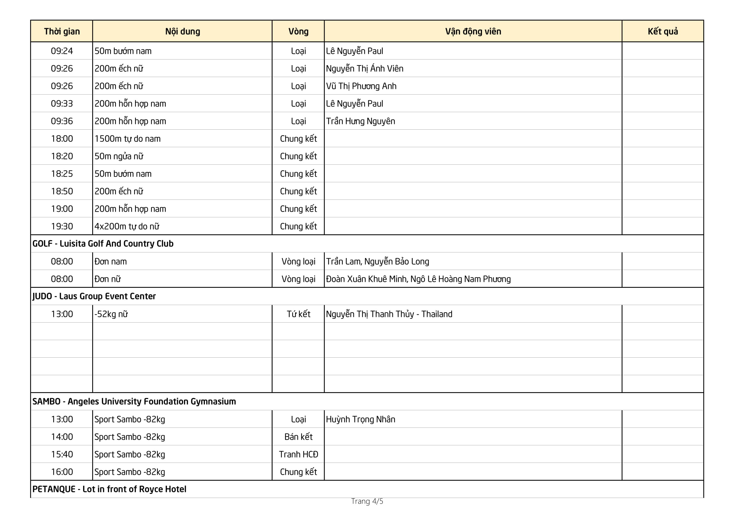 Tứ kết nội dung dưới 52kg nữ môn Judo của Nguyễn Thị Thanh Thủy gặp Thái Lan sẽ diễn ra vào lúc 13:00 tại Laus Group Event Center. Môn Sambo diễn ra tại Angeles University Foundation với các nội dung Gymnasium Sport Sambo -82kg Loại Huỳnh Trọng Nhân, Sport Sambo -82kg Bán kết, Sport Sambo -82kg Tranh HCĐ và Sport Sambo -82kg Chung kết từ 13:00.