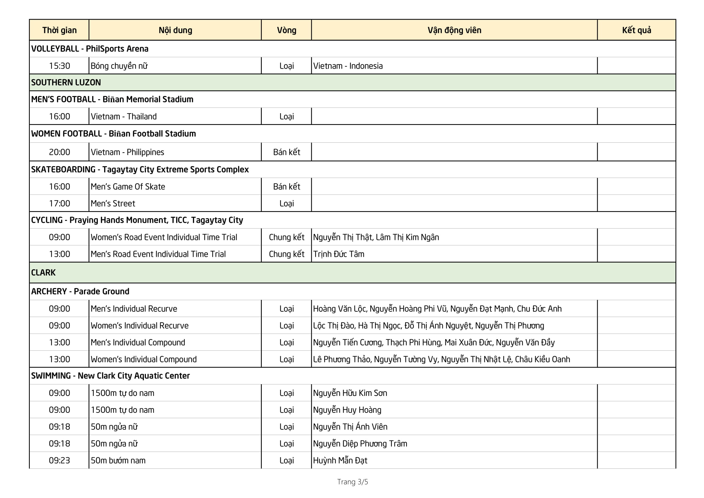 Bán kết đồng đội đôi nam môn Cầu mây giữa Việt Nam và Indonesia sẽ diễn ra vào lúc 9:30 giờ địa phương tại Subic Bay Gymnasium. Thi đấu đội nữ vòng trong môn bóng chuyền bãi biển nội dung đội nữ vòng tròn giữa Việt Nam và Malaysia sẽ diễn ra vào lúc 14:00 giờ địa phương.