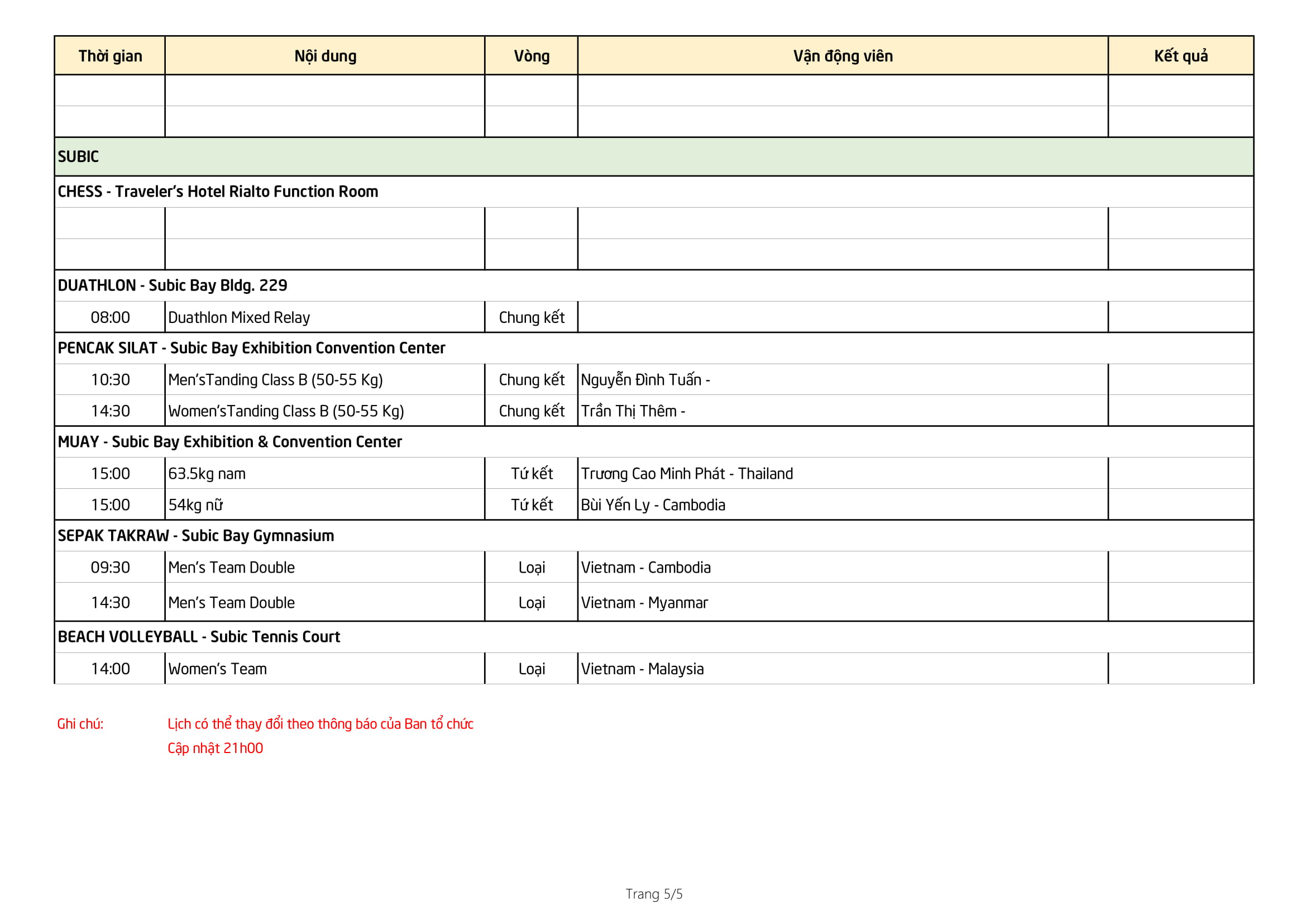Vào lúc 15:00 giờ địa phương sẽ diễn ra thi đấu Hạng nam dưới 63kg của Trương Cao Minh Phát - Thái Lan và Hạng nữ dưới 54kg Bùi Yến Ly - Campuchia của môn Muay ở Subic Bay Exhibition & Convention Center.