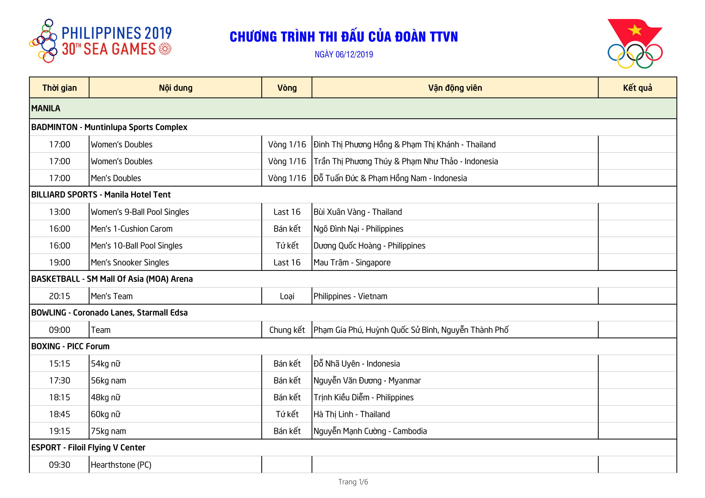 Cùng với Quần vợt, ngày mai (6/12), các VĐV tiếp tục bước vào tranh tài ở các môn: Billiards Sports, Boxing, Bowling, Cầu lông, Bóng rổ 5x5, Đấu kiểm, Thể thao điện tử và chung kết nội dung thi đấu xuất phát đồng hàng nữ,...