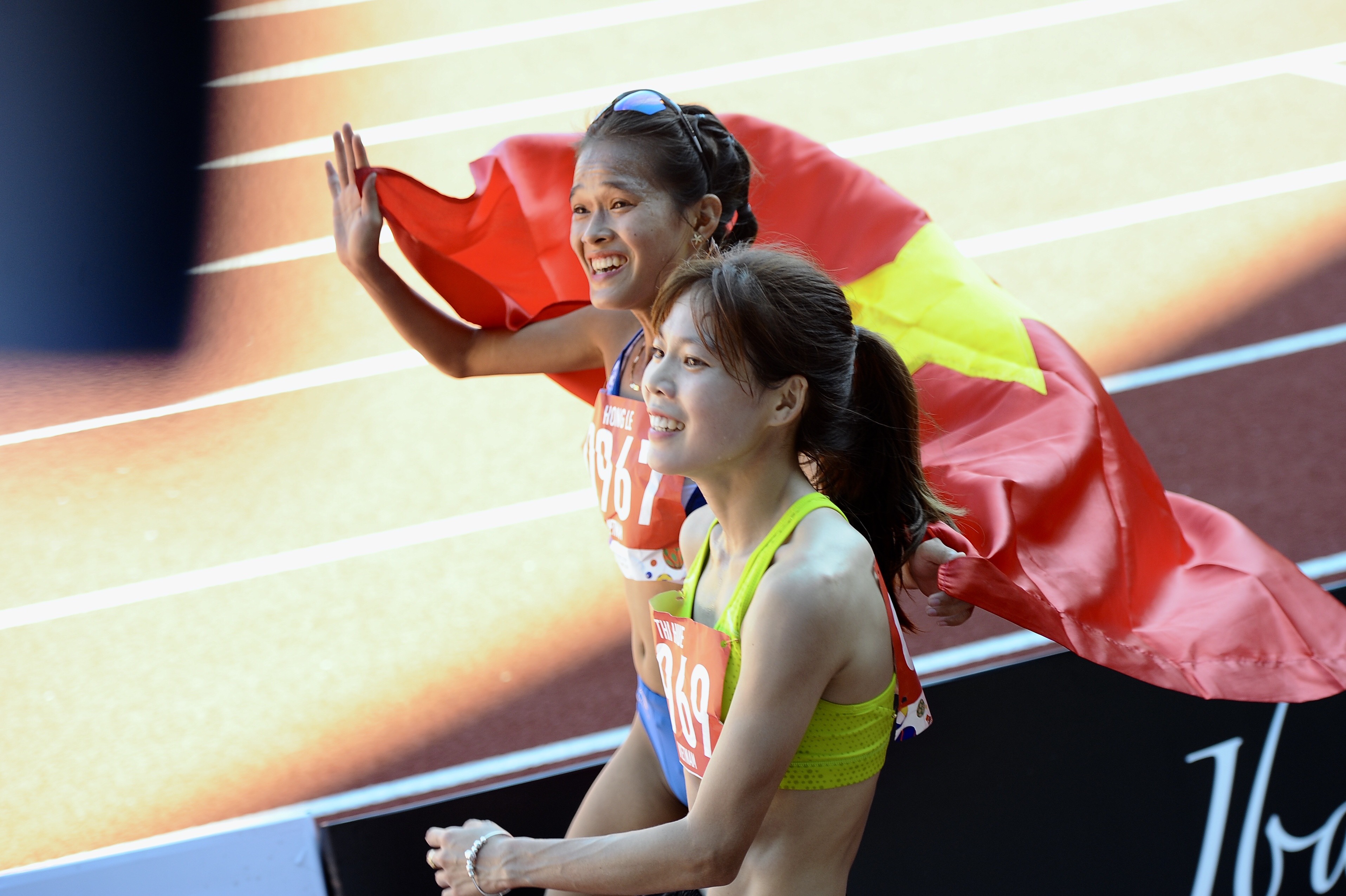 Ở nội dung 10.000 nữ, Phạm Thị Huệ và Phạm Thị Hồng Lệ đã dắt tay nhau giành các ngôi vị Quán quân và Á quân cho đoàn TTVN (Ảnh: Văn Duy)
