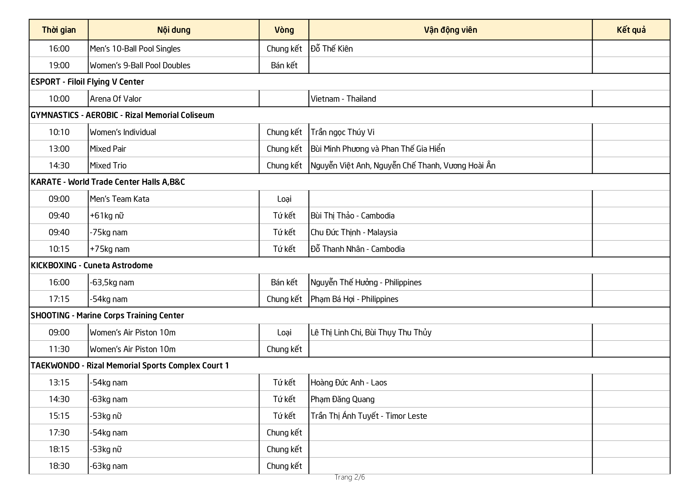 Cùng với đó, trên đường đua xanh, Ánh Viên tiếp tục tranh tài ở 2 nội dung là 800m tự do và 100m bướm. Môn Boxing sẽ bước vào thi đấu 13 trận chung kết, taekwondo với 3 trận chung kết ở các hạng cân 54kg nam, 53kg nữ và 63kg nam. Ngoài ra, đoàn TTVN còn tranh tài ở trận chung kết bóng chuyền nữ, bắn cung, billiard, bóng bàn, bắn súng, karate, bóng rổ...