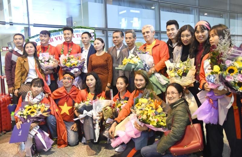 Sau khi máy bay đáp xuống sân bay Nội Bài, đoàn Thể thao Việt Nam được chia thành 2 nhóm, thầy trò HLV Park Hang Seo (Bóng đá nam) và thầy trò HLV Mai Đức Chung (Bóng đá nữ) được đón về thẳng trụ sở Chính phủ dự buổi gặp mặt của Thủ tướng Nguyễn Xuân Phúc. Các đội tuyển còn lại được Tổng cục Thể dục Thể thao, Trung tâm Huấn luyện Thể thao quốc gia Hà Nội và các địa phương nơi có vận động viên tranh tài bố trí xe riêng đưa đón các thành viên trong đoàn.