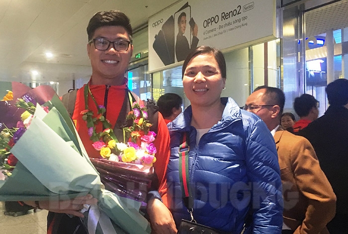 Cung Thủ Nguyễn Hoàng Phi Vũ chụp ảnh lưu niệm cùng người mẹ của mình (Thethao.vn)