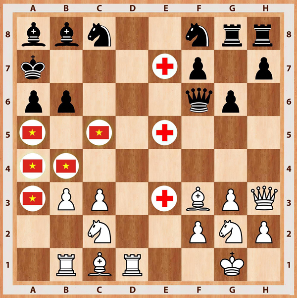 Bên Trắng có 13 quân cờ (Vua, 1 Hậu, 2 Xe, 2 Tượng, 2 Mã và 5 Tốt) được xếp theo hình số "19", đại diện cho các Chiến Sỹ Áo Trắng và người dân Việt Nam đang tấn công tiêu diệt "Giặc COVID 19", từ cuối năm 2019.