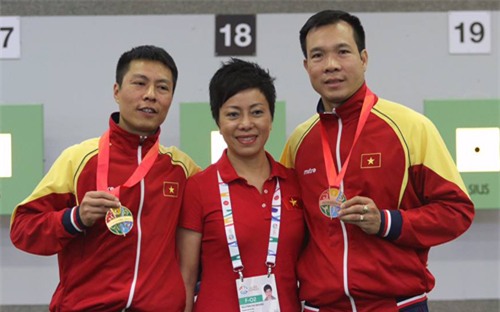 2 Xạ thủ kỳ cựu của Bắn súng Việt Nam Trần Quốc Cường và Hoàng Xuân Vinh cùng HLV trưởng Nguyễn Thị Nhung (Ảnh: TTXVN)