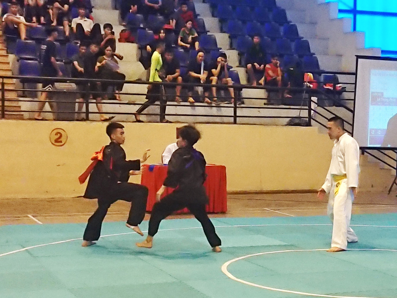 Trận đấu loại hạng 45kg nam lứa tuổi 15 - 17 sáng ngày 7/7 giữa Thanh Hóa (đỏ) và Bình Dương (xanh) (Ảnh: Đức Thịnh)
