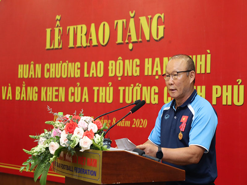 Phát biểu cảm tưởng về vinh dự này, Huấn luyện viên Park Hang-seo chia sẻ: "Trước tiên, cho tôi gửi lời cảm ơn tới Chính phủ Việt Nam, Bộ trưởng Bộ Văn hóa, Thể thao và Du lịch, Chủ tịch Liên đoàn Bóng đá Việt Nam cùng toàn thể nhân dân Việt Nam đã trao phần thưởng này cho tôi. Về mặt cá nhân, tôi càng cảm thấy vinh dự, tự hào khi biết rằng đây là phần thưởng quý giá lần đầu tiên được trao cho người nước ngoài trong lĩnh vực Bóng đá. Tuy nhiên, tôi hiểu rằng tấm Huân chương này được trao cho tôi và cũng là trao cho tập thể Huấn luyện viên, Cầu thủ và lực lượng Hậu cần đã sát cánh cùng tôi thời gian qua. Tấm Huân chương này sẽ là nguồn động lực để chúng tôi nỗ lực hơn nữa vì sự phát triển của Bóng đá Việt Nam. Hiện nay ở Việt Nam, dịch bệnh Covid-19 vẫn ảnh hưởng tới các giải đấu trong nước, với cá nhân tôi, tôi không cho rằng đây là thời gian mình được phép đứng im mà phải nghiên cứu chiến thuật để phát triển hơn nữa các đội tuyển Bóng đá Việt Nam.."