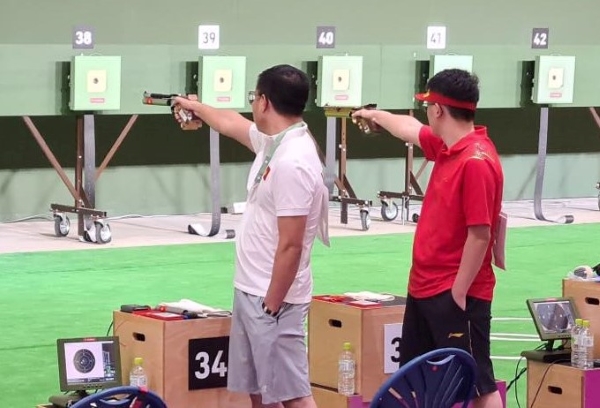 Xạ thủ Hoàng Xuân VInh (áo trắng) trong lượt bắn ở vòng loại (Ảnh: Thu Sâm/Đoàn TTVN)