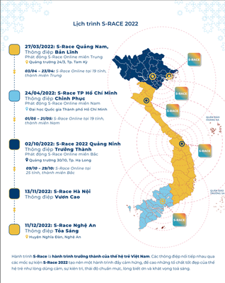Sự kiện thi đấu đầu tiên của S-Race 2022 sẽ diễn ra tại Quảng Nam, được tường thuật trực tiếp vào 7h00 – 10h00 ngày 27/3/2022 trên kênh VTV6.