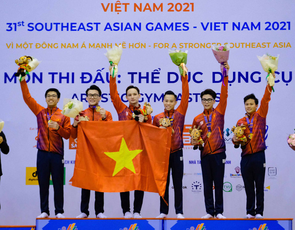 VĐV Đặng Xuân Thiện (thứ 2 từ phải qua) tron niềm vui chiến thắng cùng các đồng đội của tuyển TDDC Việt Nam (Ảnh: Văn Duy)