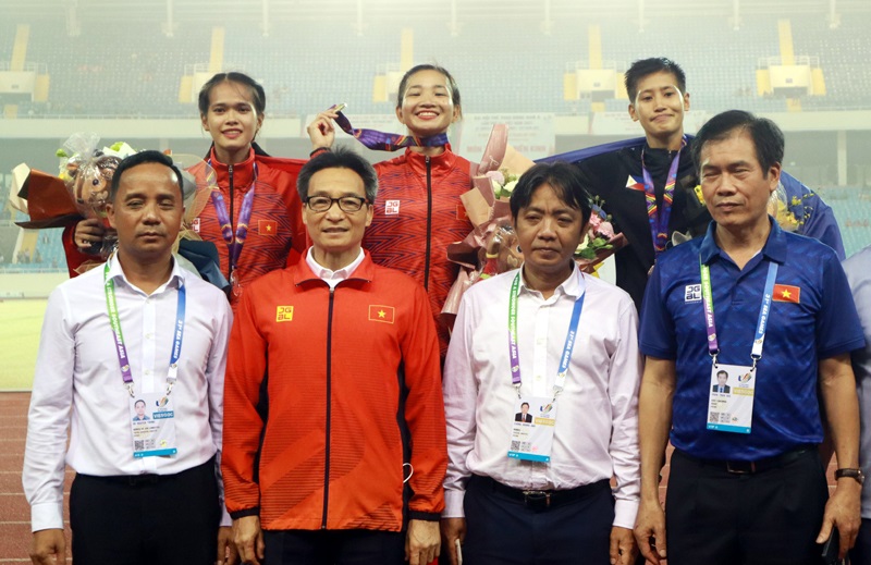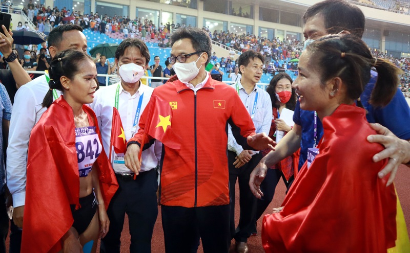 Phó Thủ tướng Vũ Đức Đam xuống sân chúc mừng thành tích của Nguyễn Thị Oanh và Phạm Thị Hồng Lệ