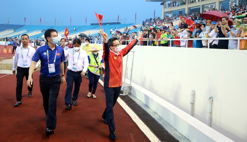 Phó Thủ tướng Vũ Đức Đam vẫy tay chào khán giả có mặt tại sân vận động quốc gia Mỹ Đình