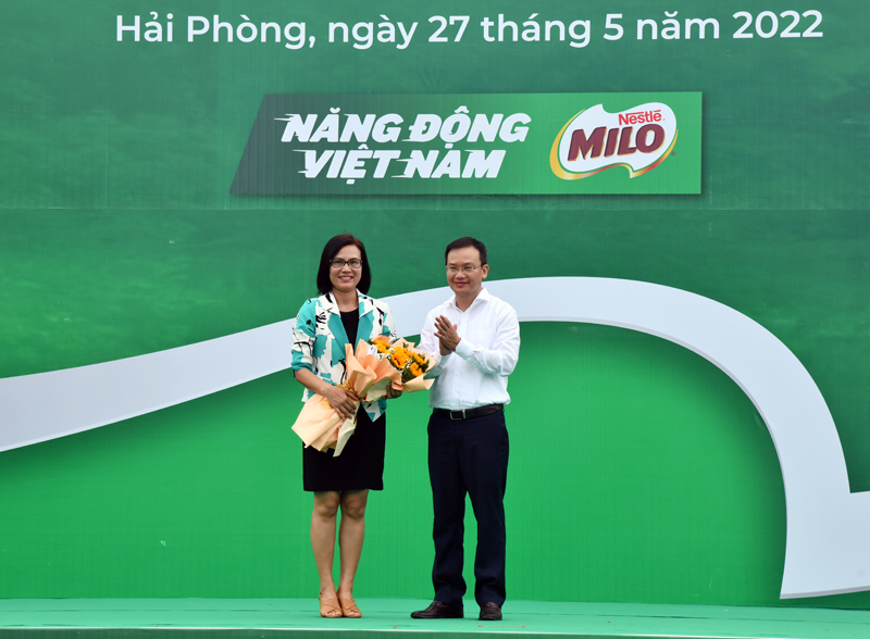 Phó tổng cục trưởng TCTDTT - Nguyễn Hồng Minh tặng hoa cho Nhà tài trợ Nestle Milo