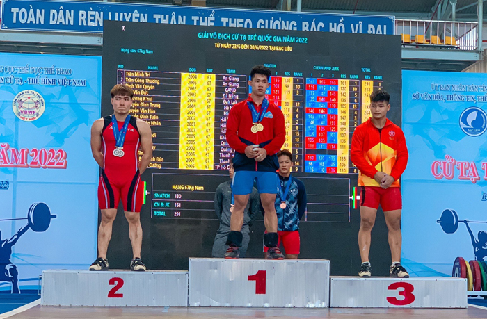 VĐV Trần Minh Trí, hạng 67kg (tuyển trẻ quốc gia) đơn vị Anh Giang; Giành 03 HCV, Phá 03 kỷ lục trẻ (06kg cử Giật, 01kg cử Đẩy và 16kg tổng cử).