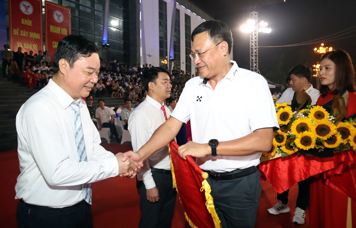 Tổng cục trưởng Tổng cục TDTT - Đặng Hà Việt tặng cờ cho các đơn vị tham dự tại Lễ khai mạc Đại hội (Ảnh: QL)