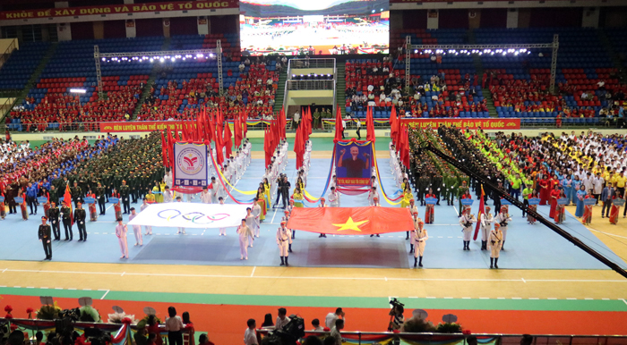 Mở đầu lễ khai mạc là màn diễu hành biểu dương lực lượng với sự tham gia của 24 khối, đoàn đại điện cho các ngành, lĩnh vực, địa phương của tỉnh. Trong đó, đi đầu là khối nghi thức với cờ Tổ quốc, cờ Olympic, kiệu ảnh Bác Hồ; tiếp theo là khối điều lệnh với các đoàn: tổ quân kỳ, khối sĩ quan quân sự, khối bộ đội biên phòng, khối chiến sĩ, khối an ninh. Cuối cùng là khối diễu hành bao gồm các đoàn: cựu chiến binh, công nhân, thanh niên, nông dân, phụ nữ, sinh viên, y tế; 8 đoàn vận động viên đến từ các huyện, thành phố tham gia thi đấu tại đại hội và tổ trọng tài.