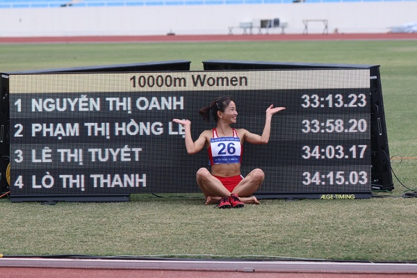Theo đó, trên đường chạy 10.000m nữ diễn ra vào ngày 17/12, Nguyễn Thị Oanh đã vượt qua các đổi thủ để cán đích với thành tích 33:13.23. Thành tích này không chỉ giúp Oanh mang về cho quê hương Bắc Giang một tấm HCV mà còn phá kỉ lục quốc gia (kỉ lục cũ 34:02.59 do Phạm Thị Hồng Lệ xác lập năm 2022 tại Hà Nội) và kỉ lục Đại hội (kỉ lục cũ 35:10.17 do Phạm Thị Huệ xác lập vào năm 2022 tại Hà Nội).