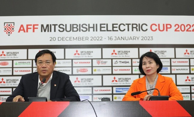 Tổng cục trưởng Tổng cục TDTT Đặng Hà Việt và Phó Tổng cục trưởng Lê Thị Hoàng Yến trong buổi trả lời báo chí về điều kiện csvc trên sân Mỹ Đình (Ảnh: C.Oanh)
