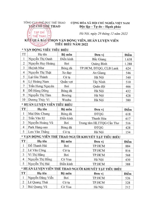 Danh sách kết quả VĐV, HLV tiêu biểu năm 2022 được BTC cuộc bầu chọn công bố