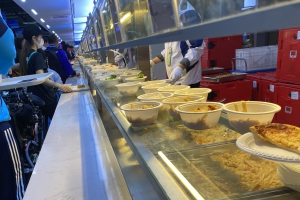 Trong phòng ăn, bàn ghế được thiết kế riêng, với kích thước được điều chỉnh để phù hợp với thông số kỹ thuật trung bình của xe lăn. Tất cả các quầy thức ăn đều được thiết kế phù hợp với tiêu chuẩn của phòng ăn dành cho VĐV khuyết tật khi được đặt ở độ cao thấp hơn bình thường một chút. Việc điều chỉnh này nhằm tạo sự thuận tiện cho các VĐV ngồi xe lăn khi họ đặt khay lên đùi khi lấy đồ ăn. Tất cả các món ăn đều được bày sẵn lên bát hoặc đĩa. Vì vậy, các VĐV chỉ cần chọn món ưa thích theo sở thích và nhu cầu