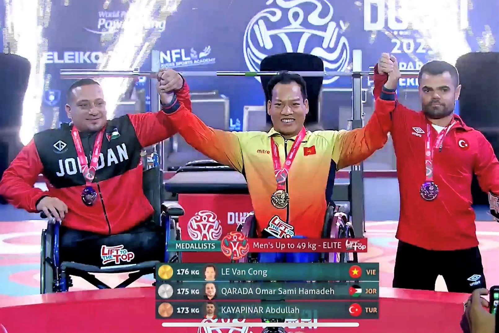 Lực sĩ Lê Văn Công giành HCV giải vô địch cử tạ người khuyết tật thế giới 2023, giành tấm vé tham dự Paralympic Paris 2024 (Ảnh: N.Phong)