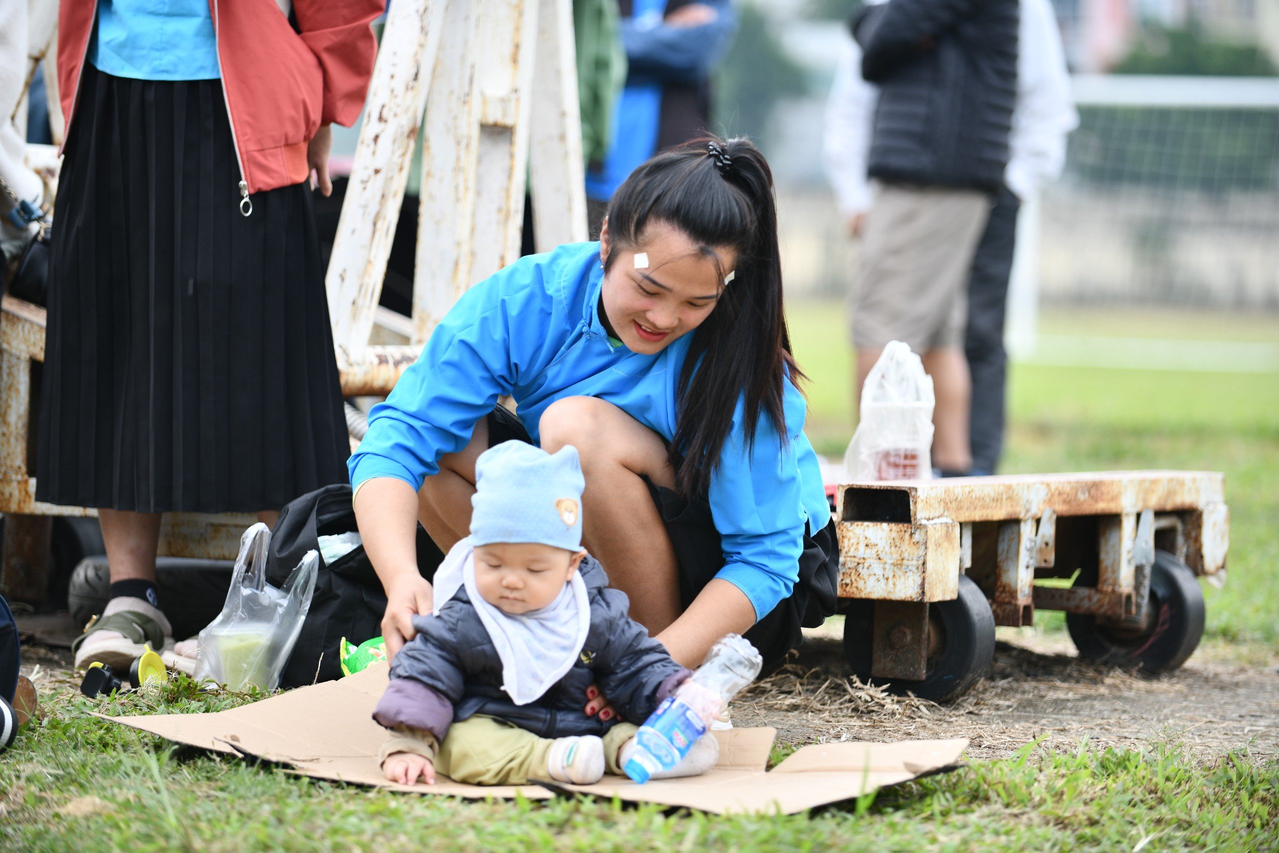 VĐV Nình Thị Sang cùng con trai 7 tháng tuổi tại SVĐ tỉnh Cao Bằng - nơi diễn ra môn Bắn nỏ Hội thi thể thao các dân tộc thiểu số toàn quốc lần thứ XIII năm 2023 (Ảnh: Kim Tuyến)