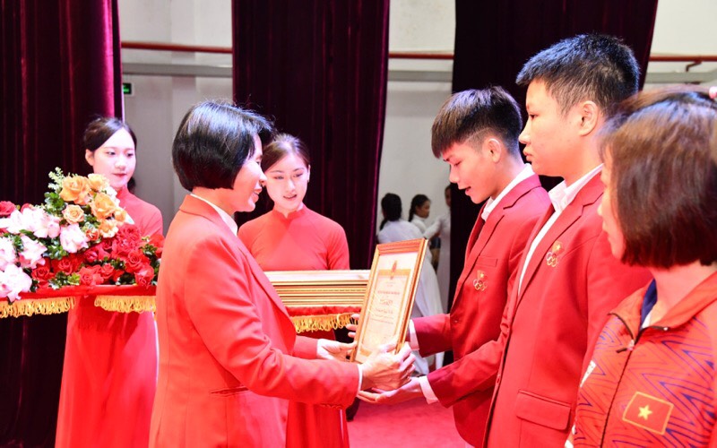 Phó Cục trưởng Cục TDTT Lê Thị Hoàng Yến trao khen thưởng cho các VĐV Hà Nội (Ảnh: Văn Duy)