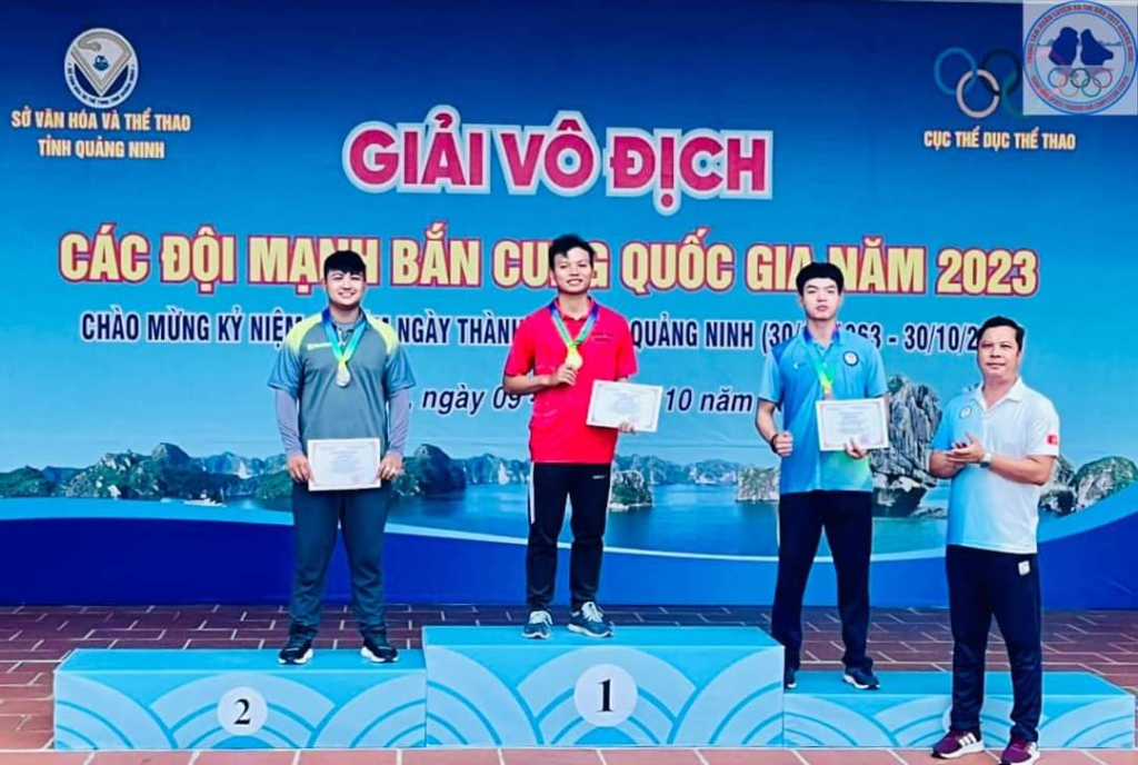Cung thủ Phạm Ngọc Tú trên bục nhận tại giải vô địch các đội mạnh Bắn cung quốc gia năm 2023 (Ảnh: QuangNinhTV)